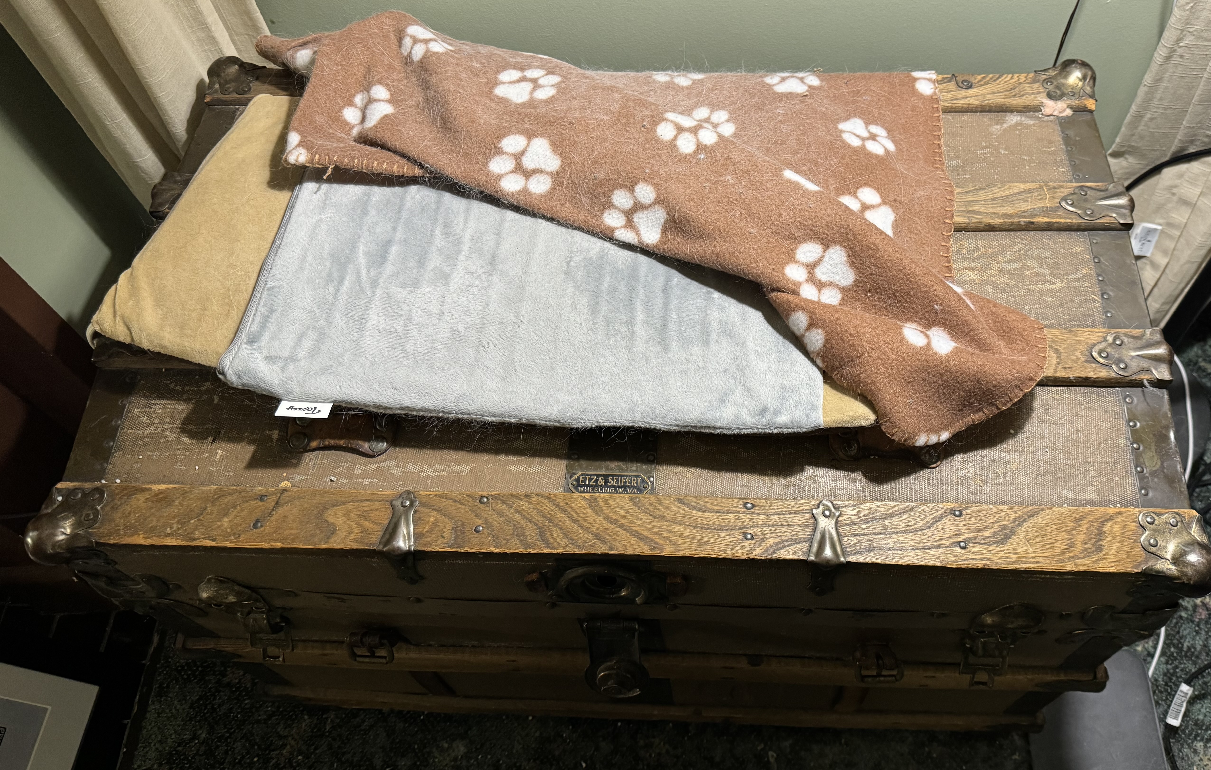 Emmitt has a favorite spot in my apartment. It’s a heating pad on top of a big trunk that was made in my home town of Wheeling, West Virginia. There’s a blanket on there too, the blanket that was in the crate with him when we met. It was his only possession.