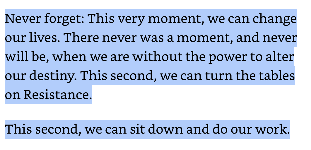 That’s basically it: the obstacle to creating the art in our hearts is not big and scary and implacable, it is merely our own reluctance. It does not matter what form this resistance takes—we can overcome it. Here’s a highlight from the book: